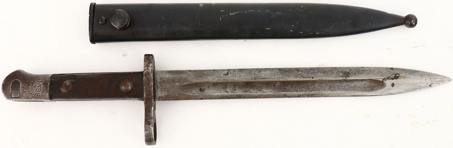 Turkish, Askari Fabrika, M1935 bayonet & sheath. The blade is bare metal with spots dark patina. The guard & pommel have toned to a dark, chocolate brown patina. The wood grips have small dings & wear. The right side of the pommel is marked ''AS.FA'', the left side is marked ''1389''. The sheath has finish wear, scratches & parts toning to a brown patina. Grade: Very Good ++ - Value: 30 to 90