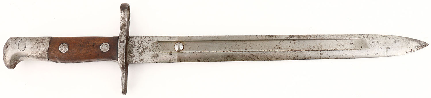 Switzerland, Neuhausen SIG, M1889/1918 Bayonet. The blade is bare steel with spots of patina. The guard & pommel are also bare steel with spots of patina. The right side of the blade is marked ''NEUHAUSEN'', ''S.I.G.''. The right side of the blade has a rivet inside the fuller. The rivet was added to the M1889 bayonets starting in 1918. they were added to keep the bayonet more securely in the scabbard. The stud was added by drilling a hole through the bayonet, the stud was welded in place and the fuller on the reverse side ground smooth. The bayonet does not have a visible S/N marking. Grade: Very Good + - Value: 40 to 100