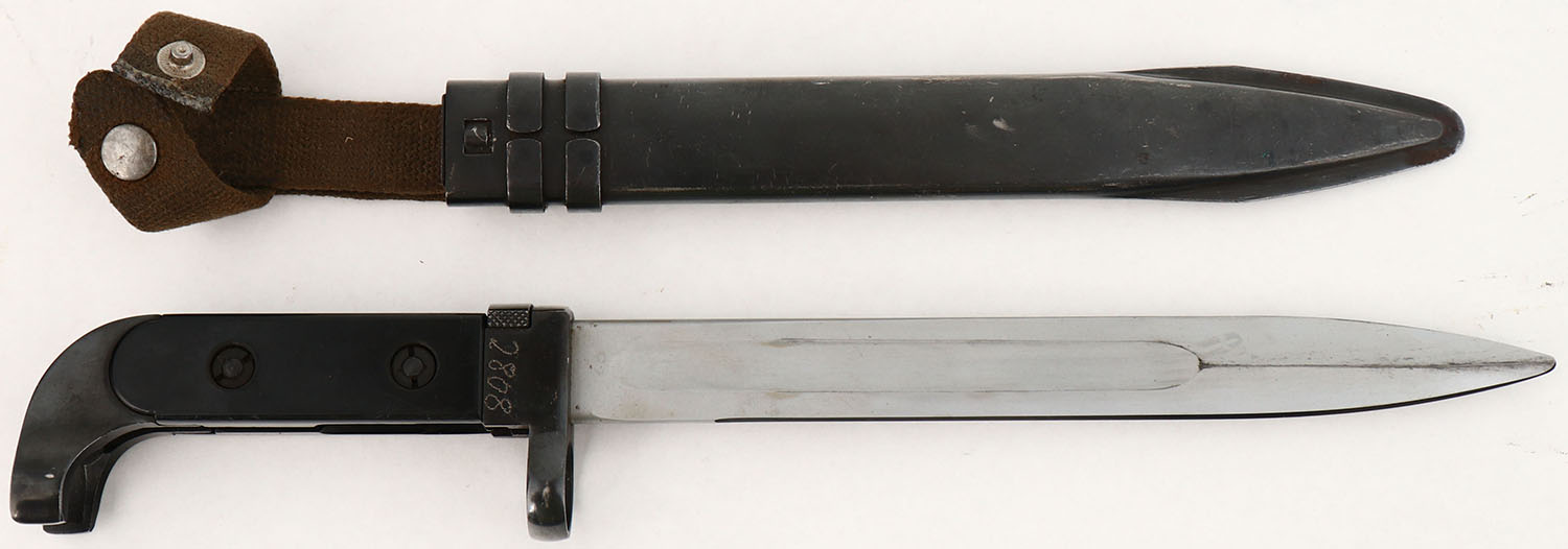 East German, AK-47 (M1951) bayonet, with sheath & frog. The blade has light sheath wear. The guard & pommel have a deep blue finish with the S/N electro penciled on the left side of the guard & is ''2808''. That mark was put over the marking ''G 8122''. The sheath/frog assembly has finish wear in spots. Grade: Excellent ++ - Value: 50 to 100
