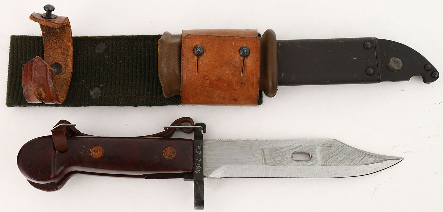 Romanian, AKM type 1 (M1959) bayonet, with sheath & frog. The blade has light sheath wear & old grease. The guard & handle have wear. The S/N ''PZ7396'' is marked on the guard & sheath. The sheath has scratches & wear. The canvas/leather frog has scuffs & handling wear. Grade: Excellent - Value: 40 to 100