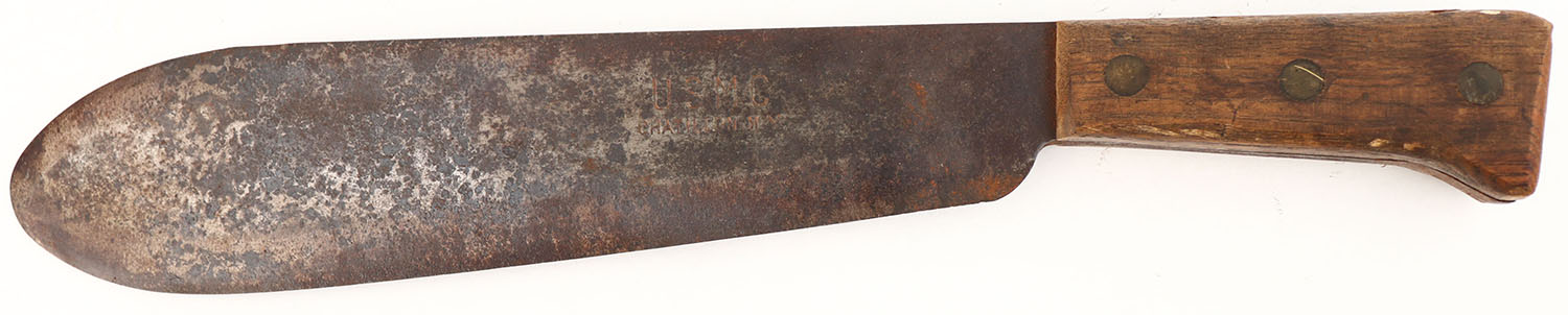 US, Chatillon, WW2 USMC Medical Corpsman Bolo Knife. The blade is fully covered in raised patina & light rust. All the metal has mostly toned to a brown patina. The wood grips have small chips, scratches & wear from use. The left side of the blade is marked ''USMC'', ''CHATILLON.N.Y.''. These bolo knife were originally made as utility knife for use in clearing brush, making splints, stretchers, & light construction, but with the close quarters of the jungles & the Japanese ambush/surprise tactics, they were used & heavily relied upon by many marines to defend themselves, with the blade being over 1/4'' thick in places I could only imagine the damage one of these things can do, these would have also came with a leather sheath but it is missing. Grade: Very Good - Value: 60 to 200