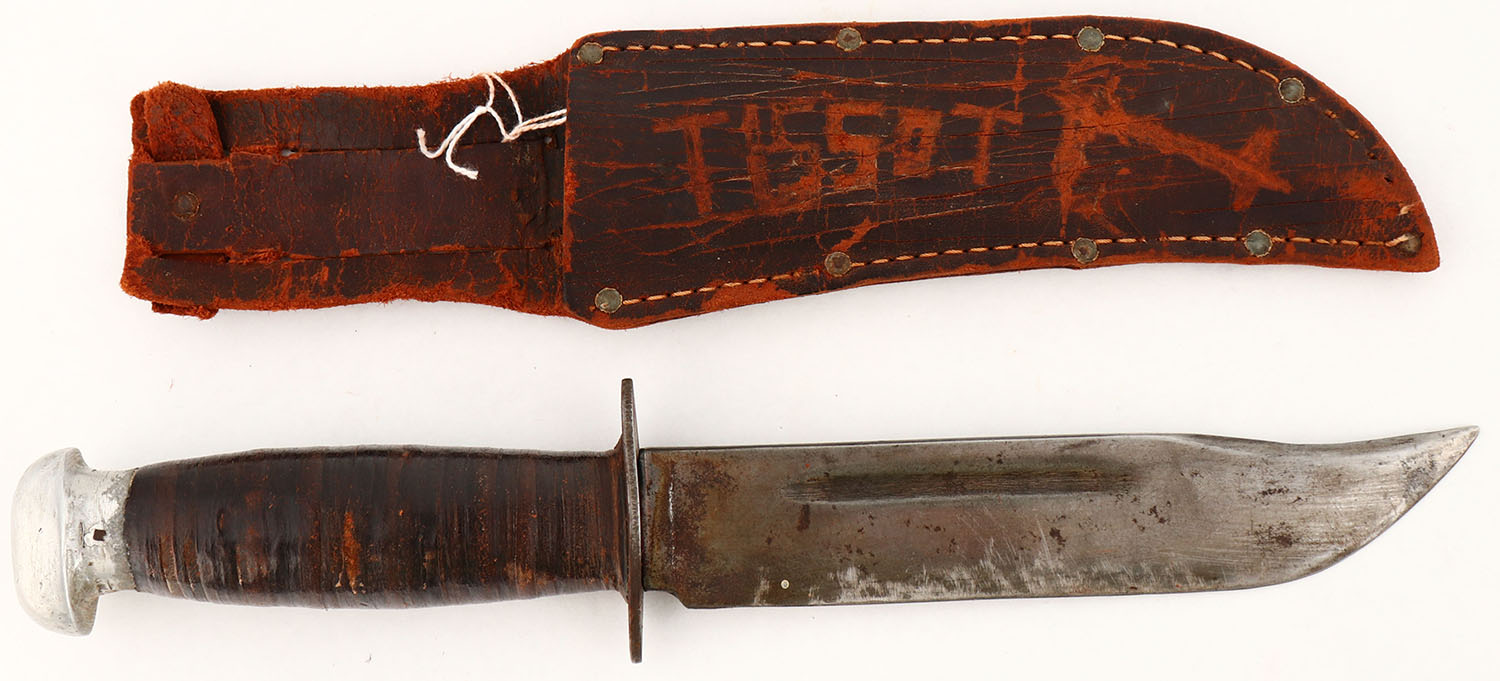 US, WW2, privately bought fighting knife. Blade has no markings. Leather disc grip. Comes with a leather sheath. This knife was privately bought by a US solder & was carried & used during the war. Grade: Very Good - Value: 20 to 40
