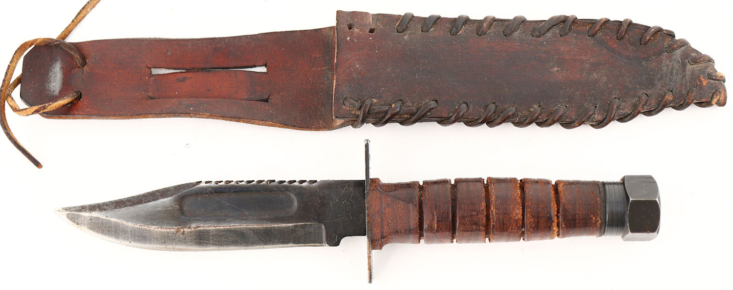US, Japanese made, Vietnam Jet pilot survival knife with sheath. The blade is blued. Blade has light finish wear & a few spots of patina. The leather handle has light wear & scuffs. The left side of the blade is marked ''JAPAN''. Comes with a homemade leather sheath. Grade: Very Good ++ - Value: 40 to 80