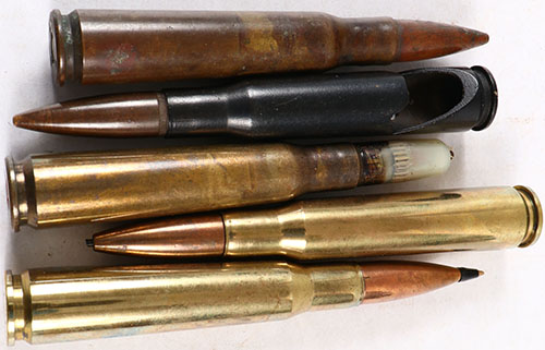 Lot of five, .50 BMG cartridges. 4 are inert with one live sabot Rd. Grade: Excellent - Value: 20 to 40