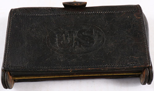 US, McKeever Cartridge box. The leather has light cracking, rub wear, & light corrosion on brass parts, but the whole box is intact with no tears or parts missing. Box has no visible marking other than the ''US'' on the front. Box comes with one copper case .45-70 Rd. Grade: Excellent - Value: 50 to 150