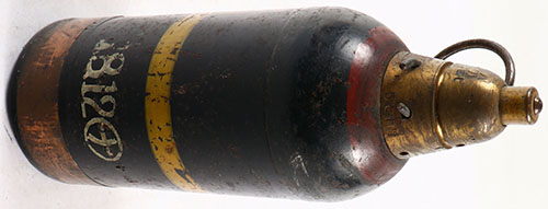 Japanese, Type 89 Knee mortar round. Round has rub marks & patina to the metal. Grade: Very Good + - Value: 200 to 400