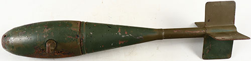 US, MK-76 practice bomb. The green paint is chipping in areas revealing rust. Grade: Very Good - Value: 100 to 200