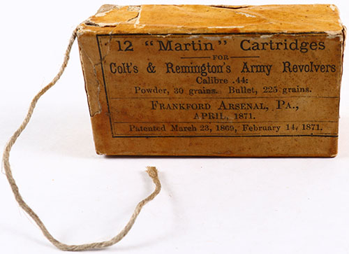 RARE!! Frankford Arsenal, Cal .44 ''Martin'' Cartridges for Colts & Remington's Army revolvers, dated April 1871, 1pc, Full & partially sealed, buff box & label with black print. The box is solid with part of the top seal torn to look inside, but is still sealed from removing the cartridges. Box has one torn seam, rub marks, light edge wear, & is covered in a clear lacquer. The ammo inside appears to be very good or excellent. Grade: Excellent - Value: 150 to 350