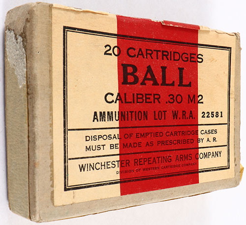 Winchester, .30 M2 Ball, Lot W.R.A. 22581, 1pc, full with French made 30-06, buff box with buff/red label & black print, the box is missing the top, has tape on the bottom & back, has light stains, & light rub wear. The ammo is very good. Grade: Very Good - Value: 10 to 30