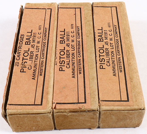 Lot of three, Western, 20 Rd., .45 M1911 Ball, ammo boxes, all are full & two are SEALED, the ammo in the open box is very good. Grade: Excellent - Value: 30 to 60