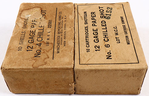 Lot of two, Winchester & western paper shotshell boxes, one No.4 chilled shot, the other is No.6 chilled shot. Both full, the No.4 shot box is starting to fall apart with seam tears. The ammo ranges from excellent to very good. Grade: Very Good + - Value: 20 to 60