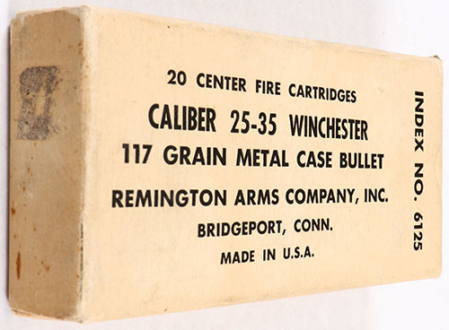 Remington, .25-35 Winchester, Index No. 6125, 1pc, full, buff box with black print, box has handling wear, ammo is excellent. Grade: Excellent + - Value: 20 to 40