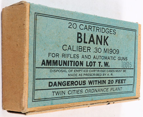 Twin Cities Ordnance Plant, .30 M1909 Blanks, Lot T.W. 18615, 1pc, Full with Mixed H/S, but correct ammo. Buff box with blue label & black print, box has multiple torn seams, & rub marks, ammo ranges from very good to good. Grade: Very Good + - Value: 8 to 20