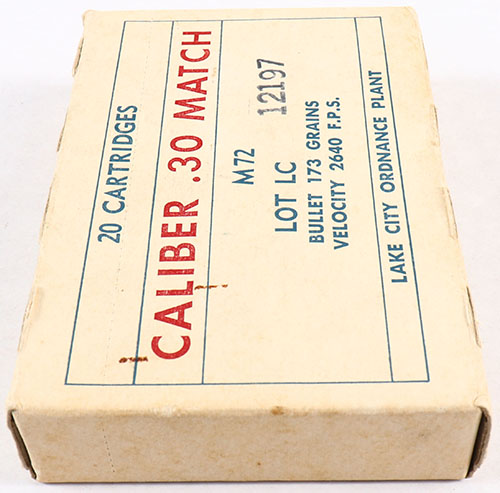 Lake City Ordnance Plant, .30 Match M72, Lot LC 12197, 1963 dated, 1pc, FULL & SEALED, white box with red/blue print, box has age soiling, & rub marks. Grade: Excellent - Value: 20 to 40