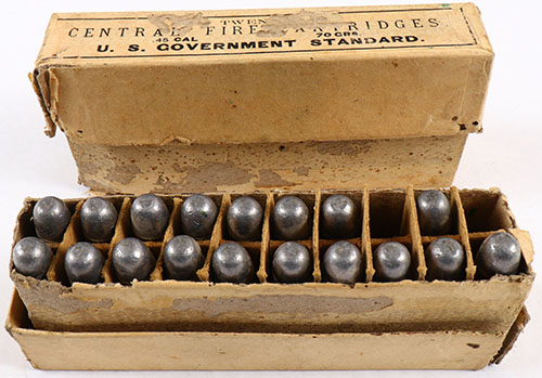 Lot of two, UMC, .45-70 2pc surplus ammo boxes, one full one partial with 18 Rds., boxes are falling apart, ammo ranges from very good to good. Grade: Good ++ - Value: 20 to 100