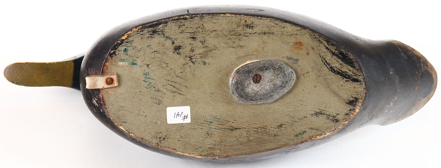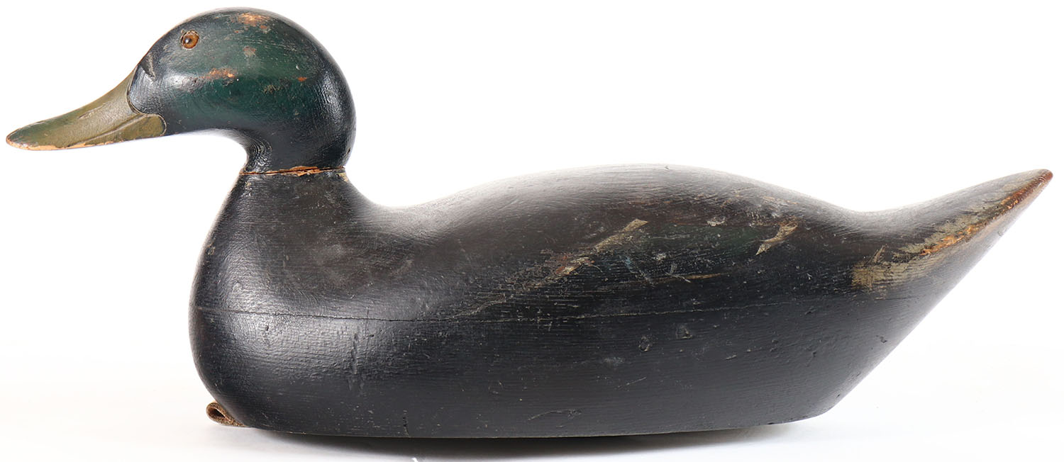 Premier Mallard Drake by Mason Decoy Company, Detroit, MI, 1896-1924, glass eyes, hollow wood, some original paint, mostly on the head otherwise old hunter strengthening, paint, structurally excellent. Original Mason weight. Grade: Excellent - Value: 100 to 200