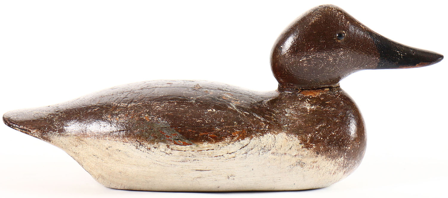 Canvasback Hen by Mason Decoy Company, Detroit, MI, 1896-1924, Standard Grade, glass eyes, mostly original paint with some strengthening to the white on the body, solid wood, has age cracks on bottom and back. Grade: Very Good ++ - Value: 100 to 200