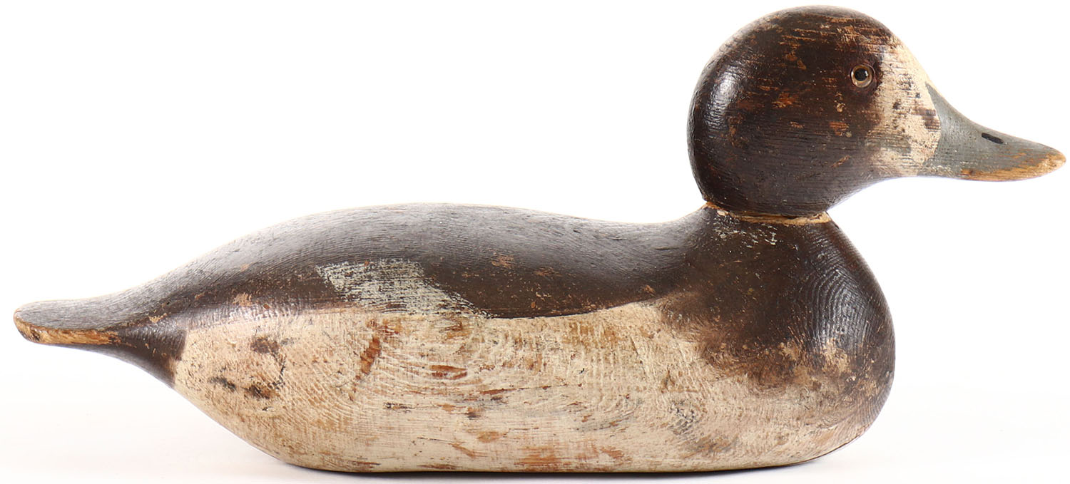 Bluebill Hen by Mason Decoy Company, Detroit, MI, 1896-1924, Standard Grade, late model, glass eyes, solid wood, original paint, has age cracks on bottom. Grade: Very Good + - Value: 100 to 200