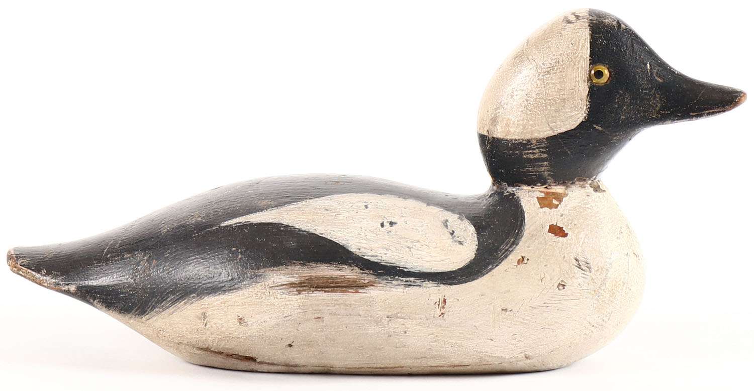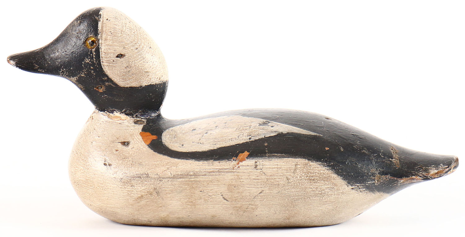 Bufflehead Drake by Mason Decoy Company, Detroit, MI, 1896-1924, Standard Grade, glass eyes, solid wood, shows a combination of original paint and paint strengthening, structurally excellent. Grade: Excellent - Value: 300 to 600