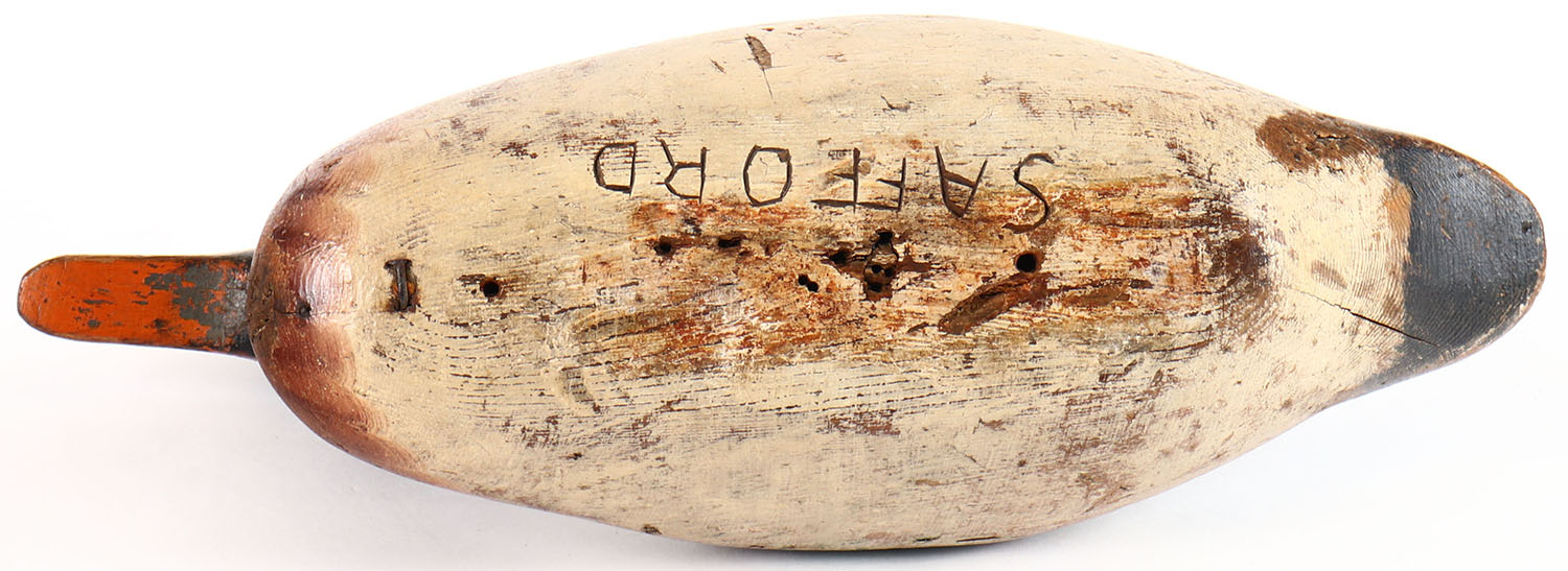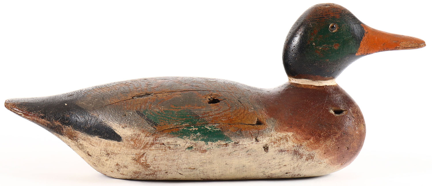 Mallard Drake by Mason Decoy Company, Detroit, MI, 1896-1924, early model Standard Grade, glass eyes, original paint, solid wood, has age cracks on back. Grade: Very Good + - Value: 50 to 200