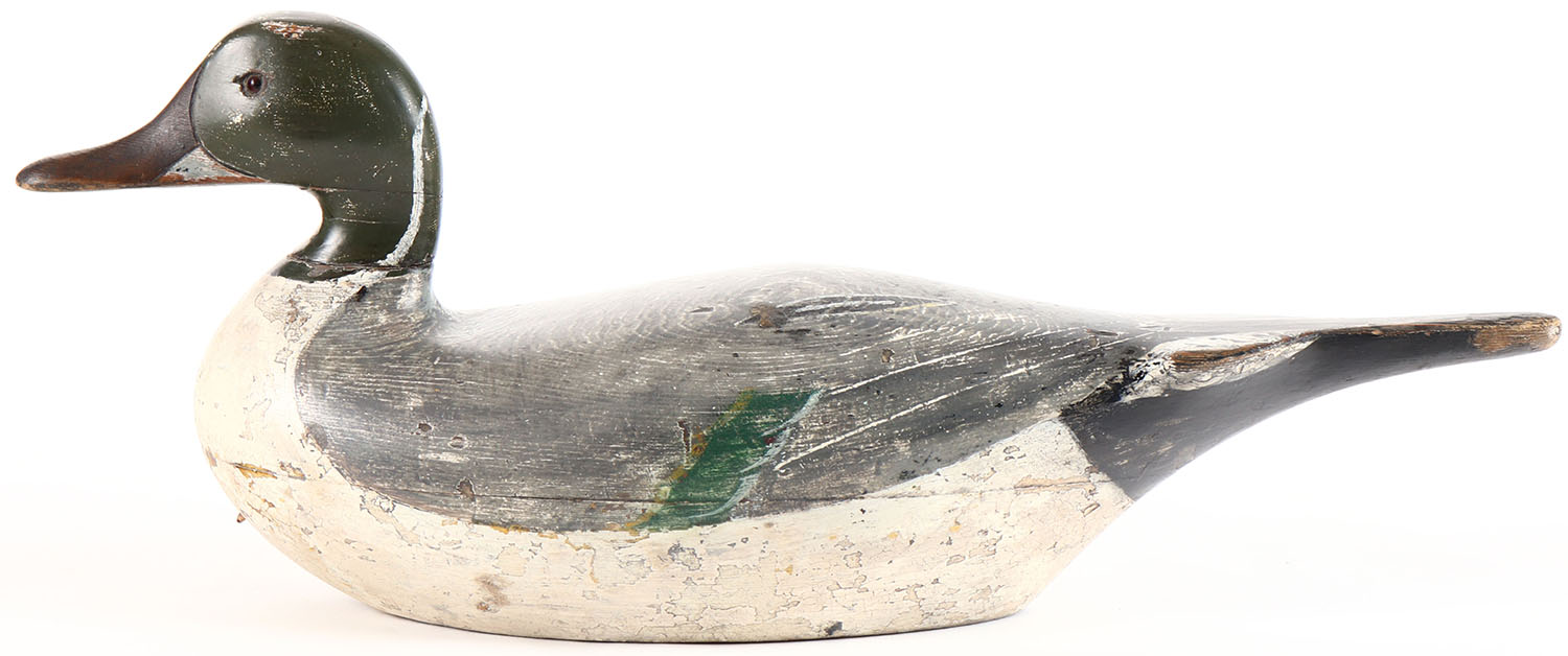 Pintail Drake attributed to Charles Bergman (1856-1946), Astoria, OR, glass eyes, solid wood, shows mostly working repaint with some original showing, structurally excellent. Grade: Excellent - Value: 100 to 200