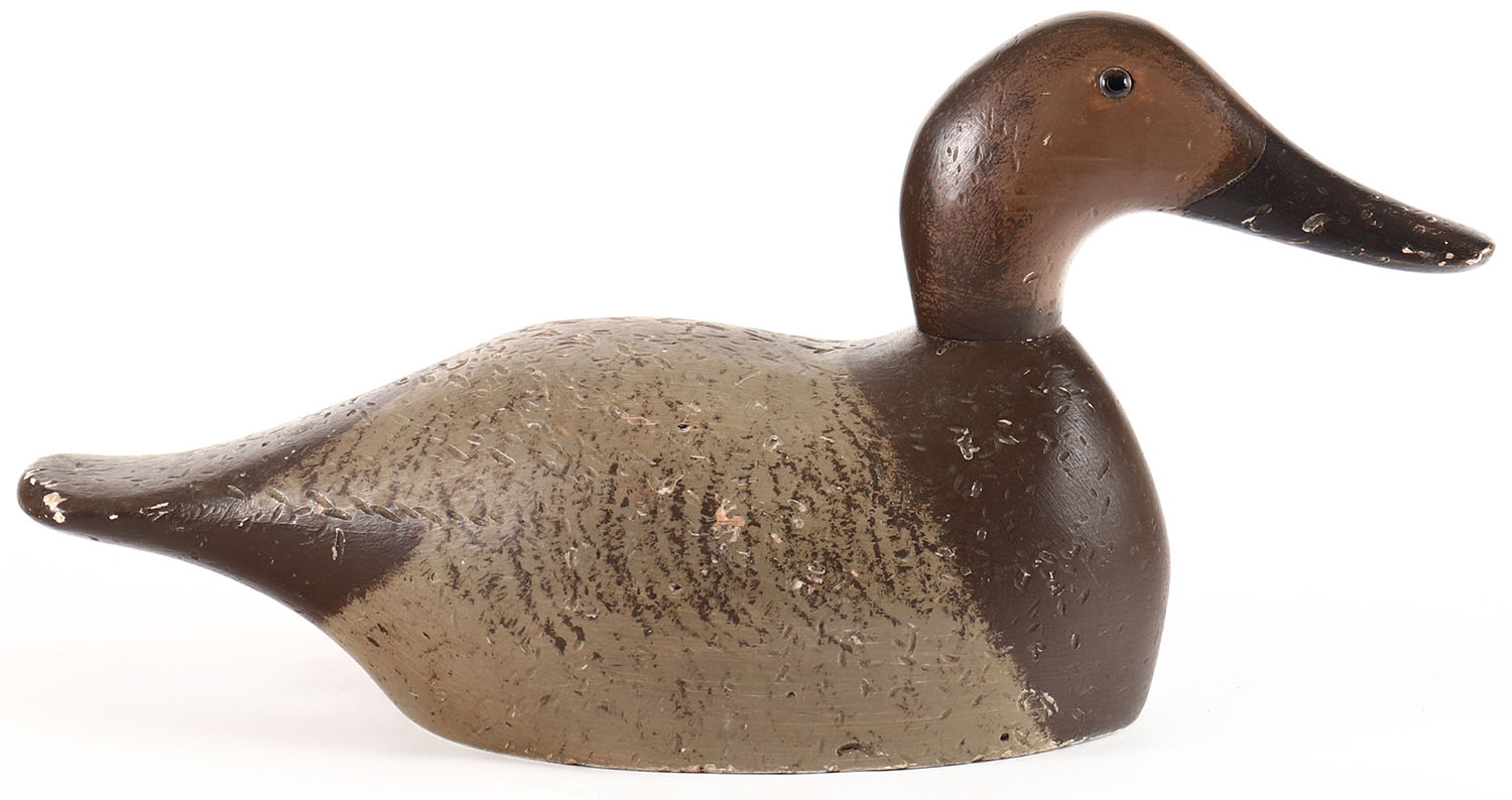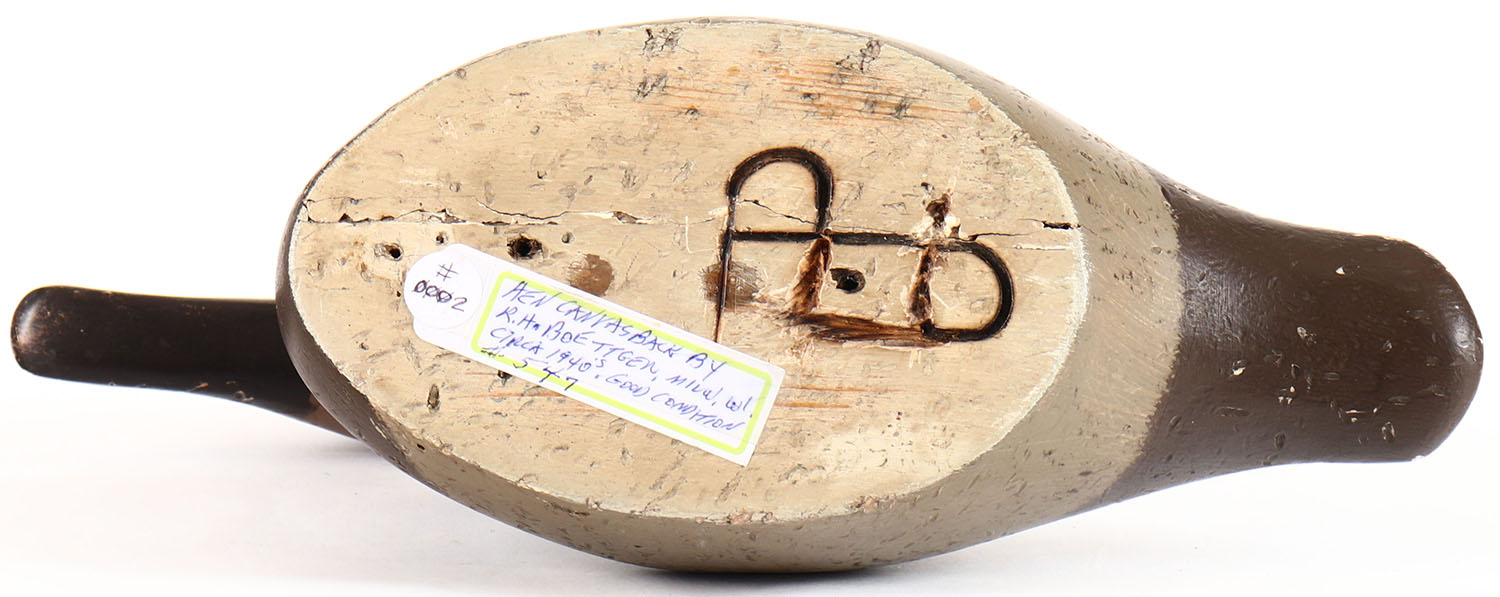 Canvasback Drake attributed to R.H. Boettgen, WI, glass eyes, hollow wood, apparent original paint, structurally excellent. Grade: Very Good ++ - Value: 70 to 150