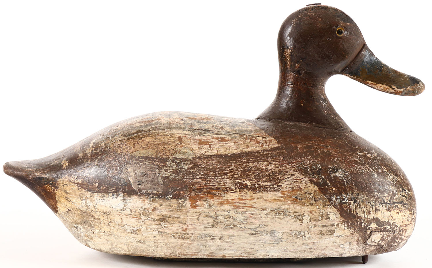 Bluebill Hen attributed to Gus Nelow, Wisconsin, glass eyes, solid wood, shows mostly restored paint, has age cracks on back. Grade: Very Good ++ - Value: 50 to 100