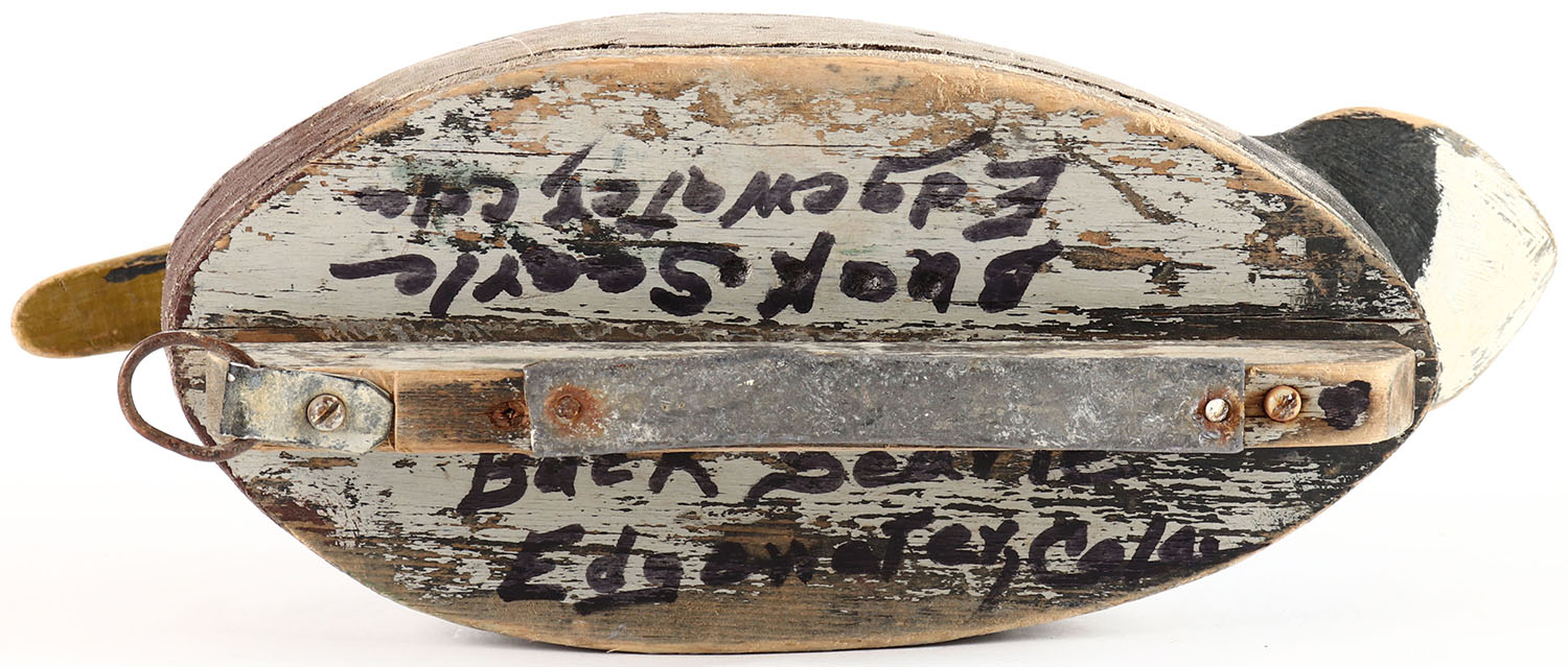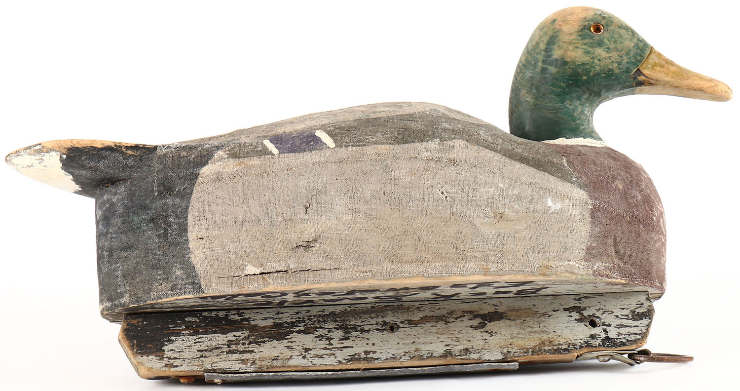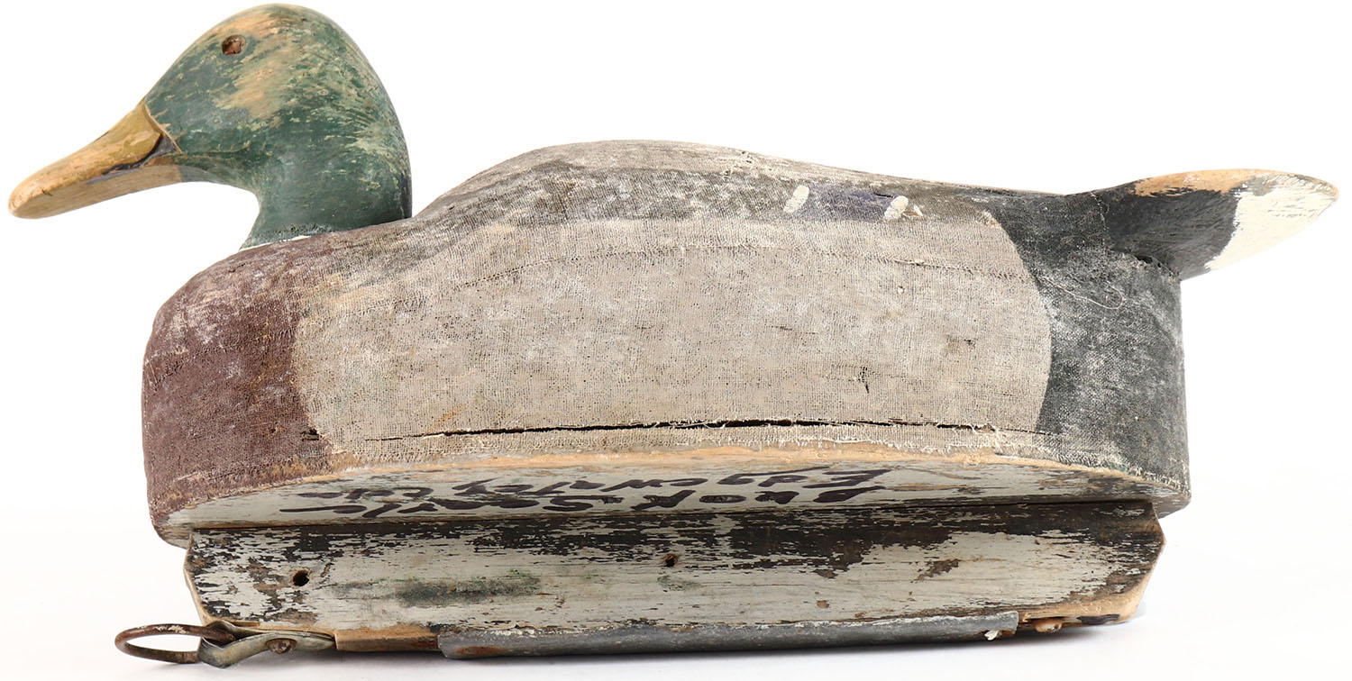 Mallard Drake by unknown maker with attribution written on bottom, glass eyes, one eye is missing, solid balsa wood, original paint. Grade: Very Good + - Value: 20 to 40