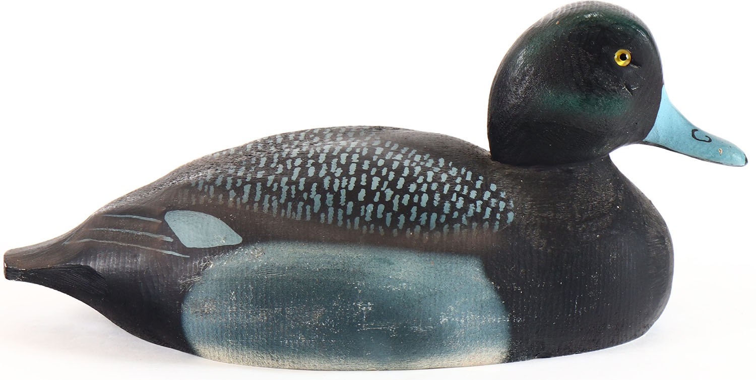 Bluebill Drake by Herters Decoy Co., Waseca, MN, 1893 series, glass eyes, solid wood, original paint, structurally excellent, branded on bottom. Grade: Excellent - Value: 50 to 100