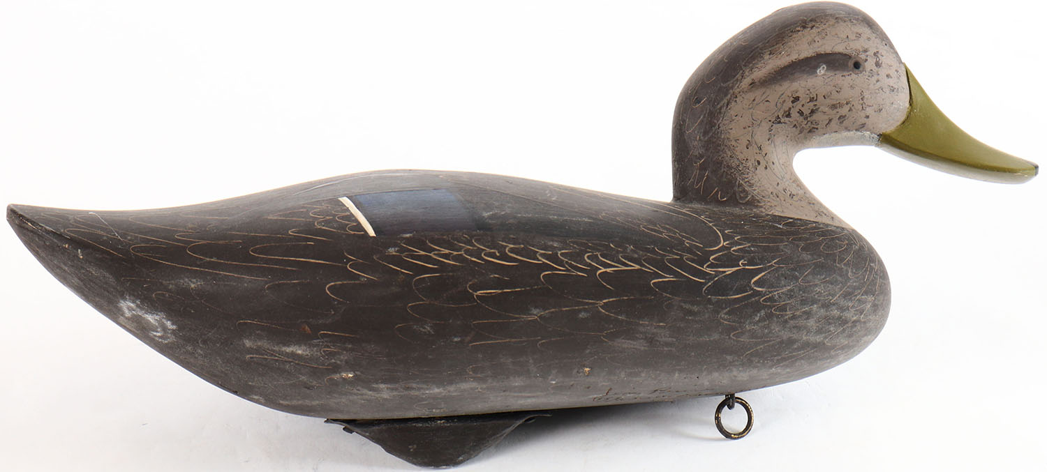 Black Duck by Jim Pierce & Son Decoys, Havre De Grace MD, painted eyes, solid wood, structurally excellent, signed on bottom by JIM PIERCE. Grade: Excellent + - Value: 50 to 100