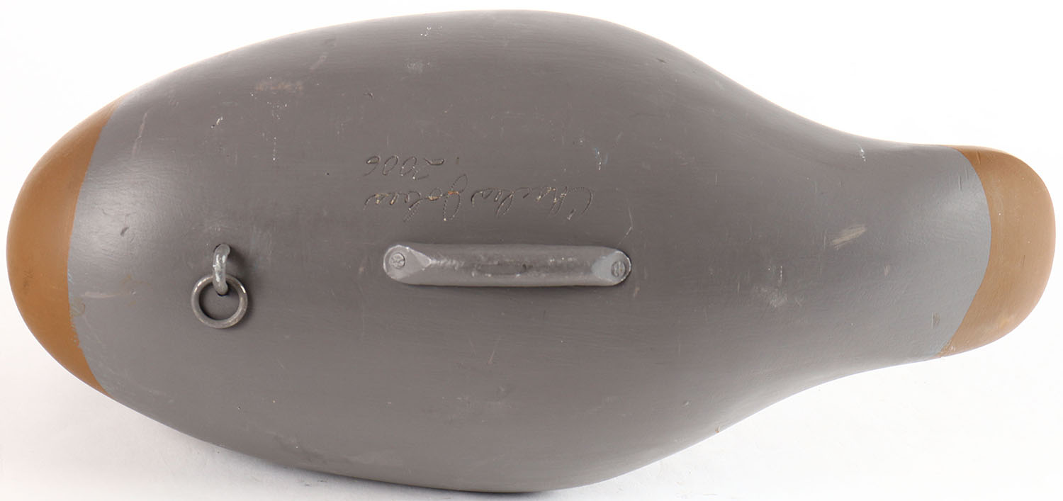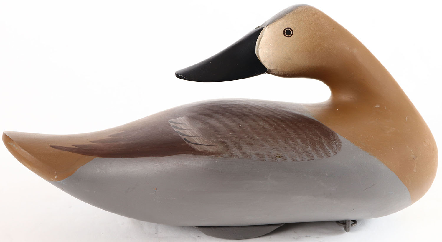 Preening Canvasback Hen by Charles Jobes, Havre de Grace, MD, painted eyes, solid wood, original paint, structurally excellent, signed on bottom by CHARLES JOBES. Grade: Excellent ++ - Value: 40 to 80