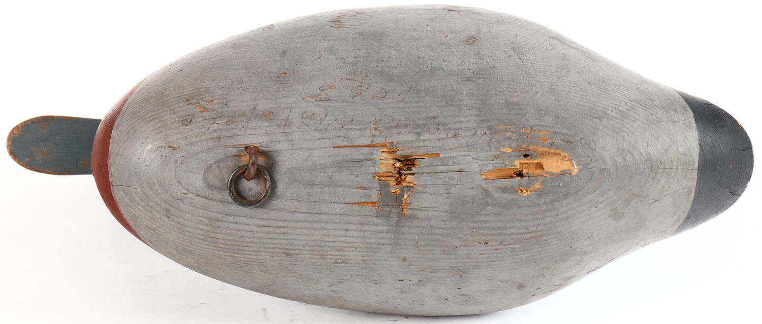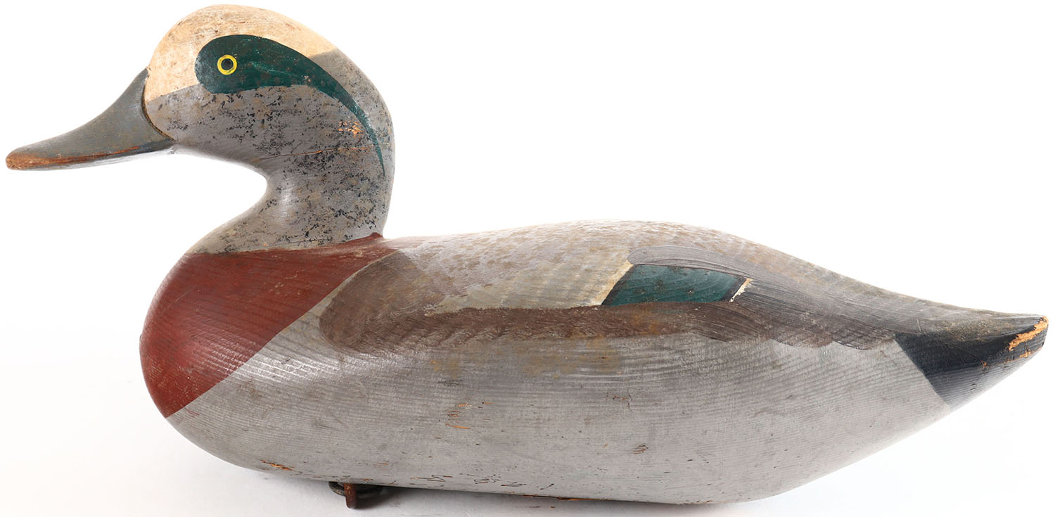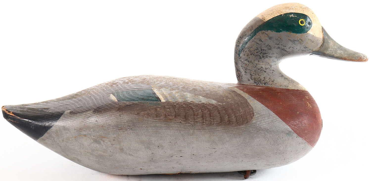 Widgeon Drake by Madison Mitchell, Havre De Grace, MD, earlier decoy, painted eyes, solid wood, original paint, has age cracks on bottom, weight missing, faint signature on bottom. Grade: Very Good + - Value: 70 to 150