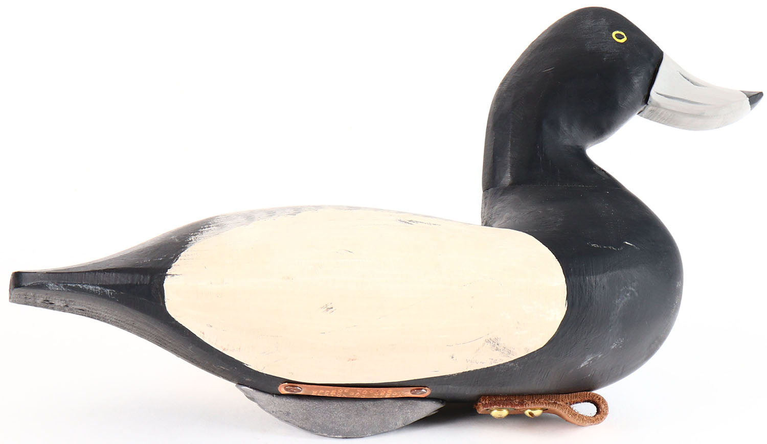 Blue Bill Drake by Joe Racine, Upper Bay Decoys, Elkton Maryland, painted eyes, solid wood, original paint, structurally excellent, branded on bottom by JOE RACINE. Grade: Excellent - Value: 20 to 40