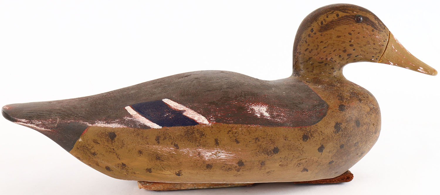 Mallard Hen Dodge Decoy Factory, Detroit, MI, 1883-1893, tack eyes, solid wood, restored paint, sructurally excellent. Grade: Very Good ++ - Value: 40 to 80