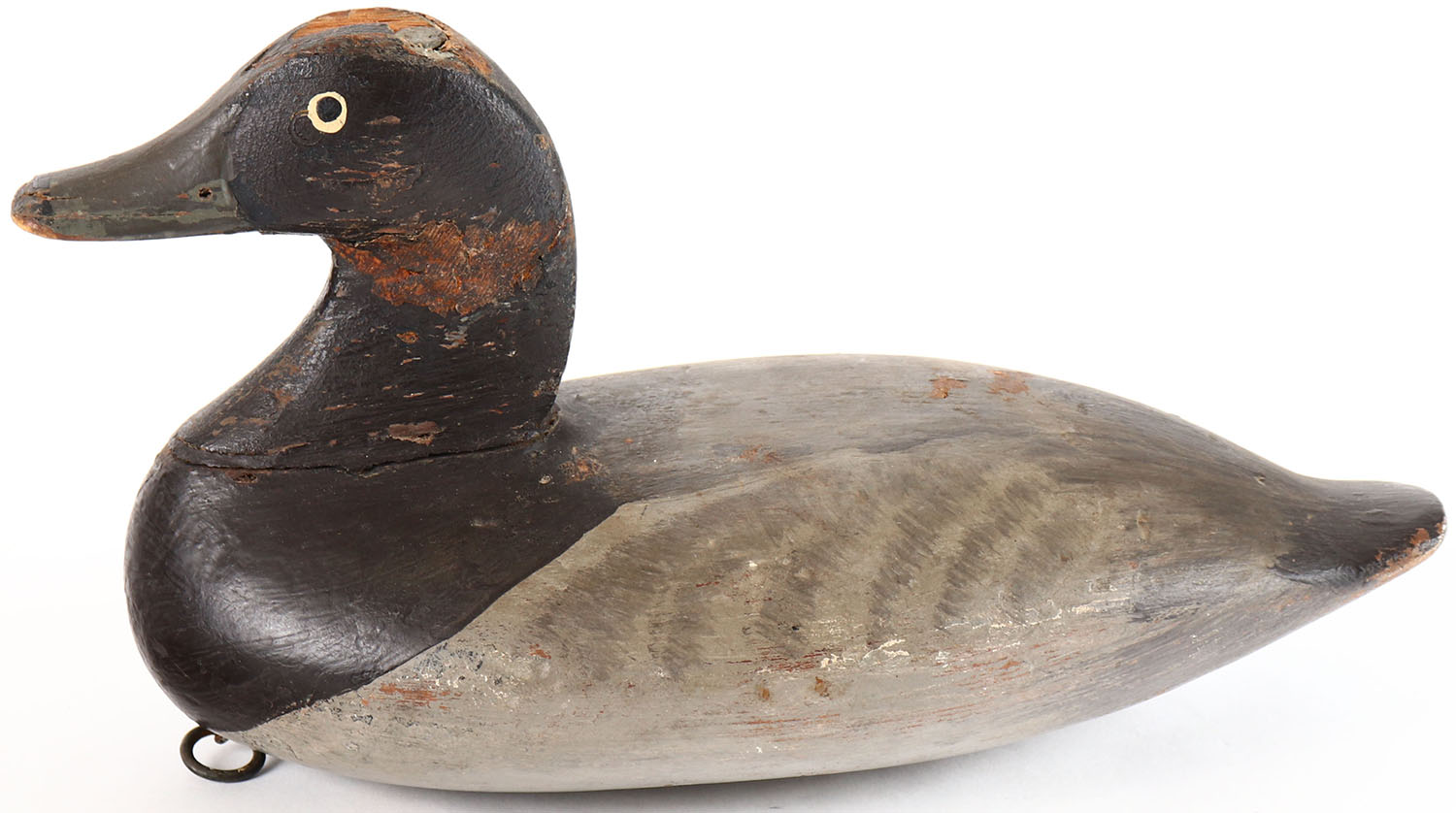 Bluebill Hen by unknown maker, painted eyes, solid wood, original paint, head shows paint missing and an old repair. Grade: Very Good - Value: 20 to 40