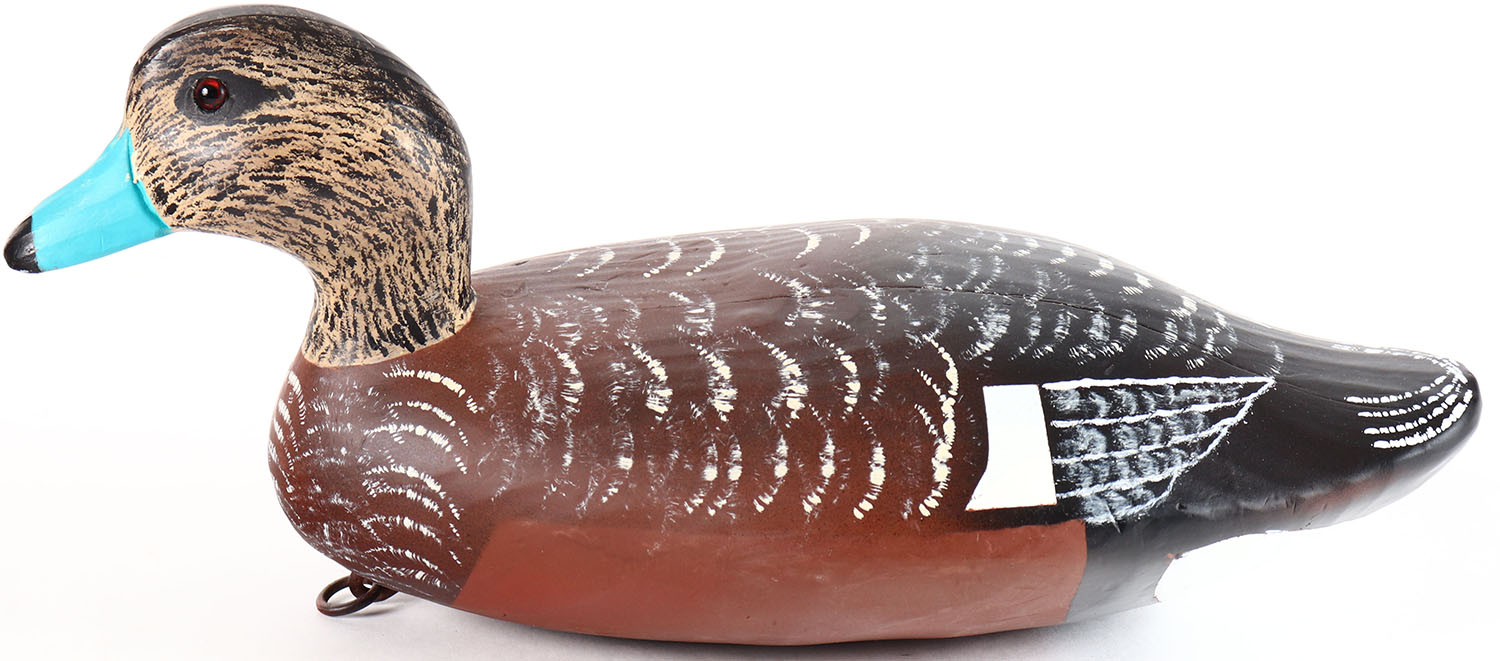 Widgeon Drake by unknown maker, glass eyes, solid wood, repainted, has age crack on bottom. Grade: Very Good + - Value: 10 to 20