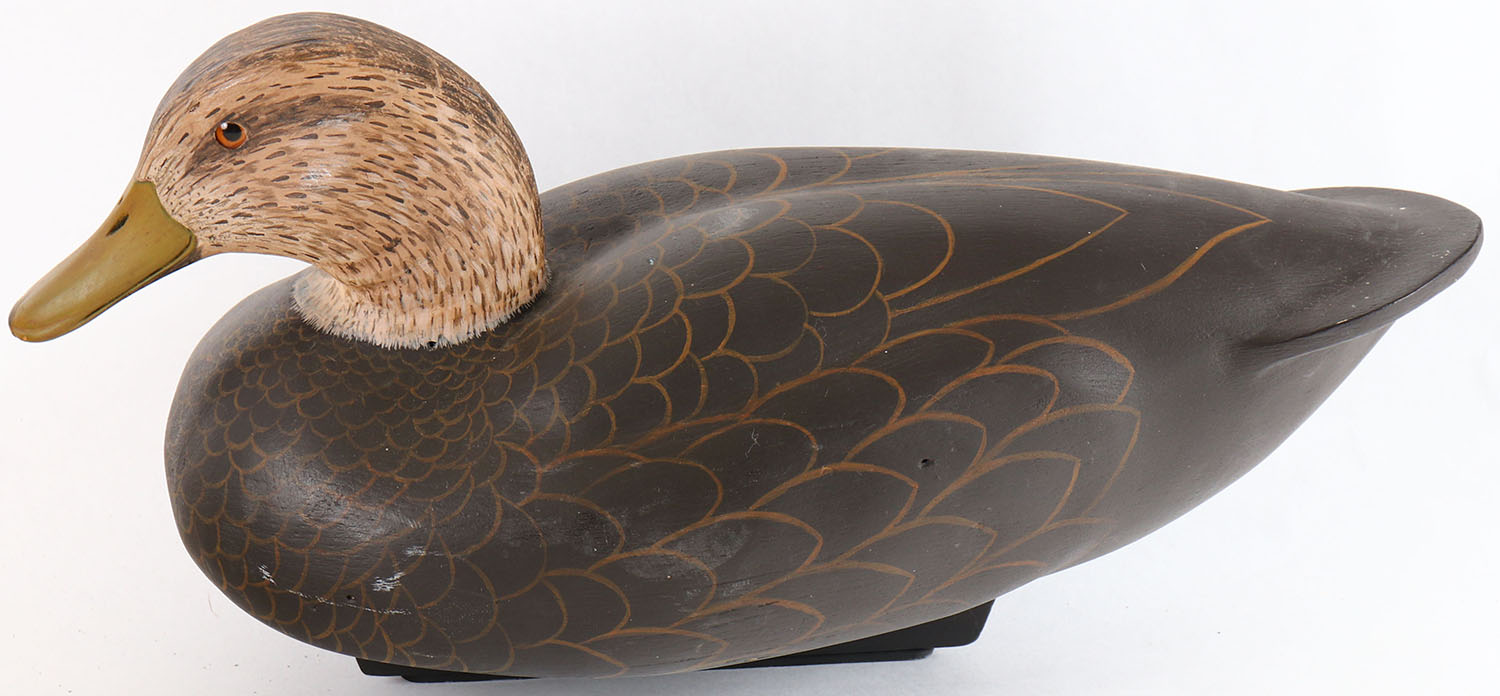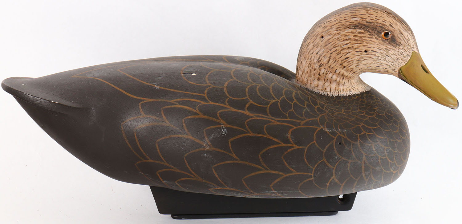 Black Duck by Cliff Peters, Clinton, Iowa, glass eyes, hollow wood, original paint, structurally excellent. Grade: Excellent + - Value: 30 to 60