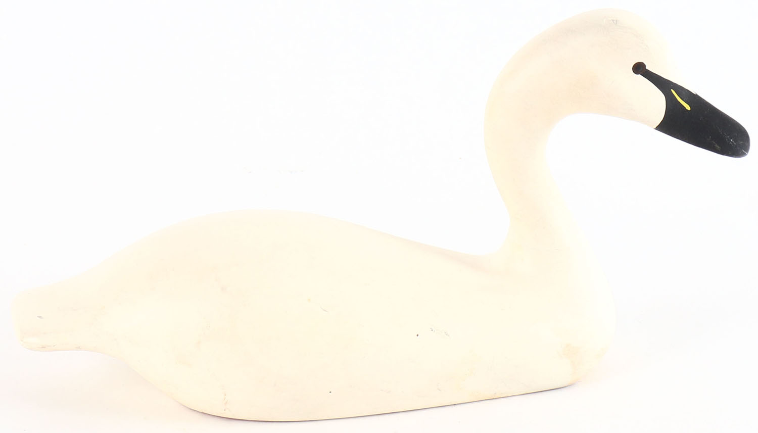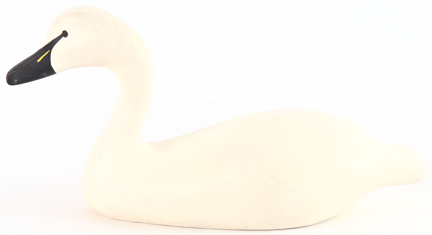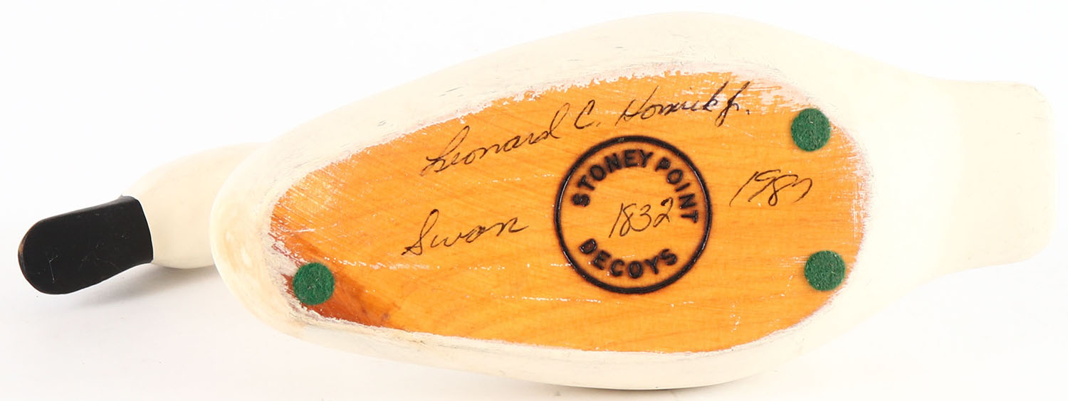 Miniature Swan by Leonard C. Hornick Jr. Stoney Point Decoys, painted eyes, solid wood, original paint, structurally excellent, branded by STONEY POINT DECOYS on bottom. Grade: Excellent ++ - Value: 10 to 20