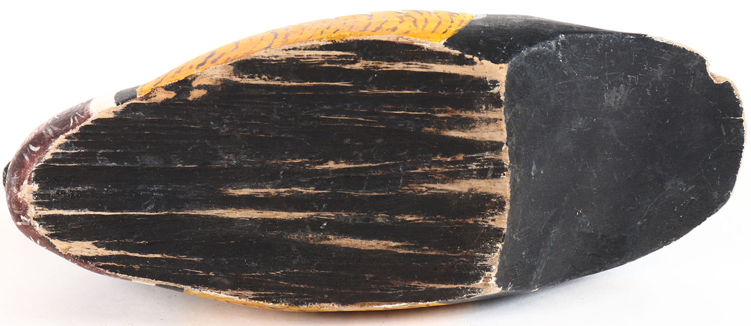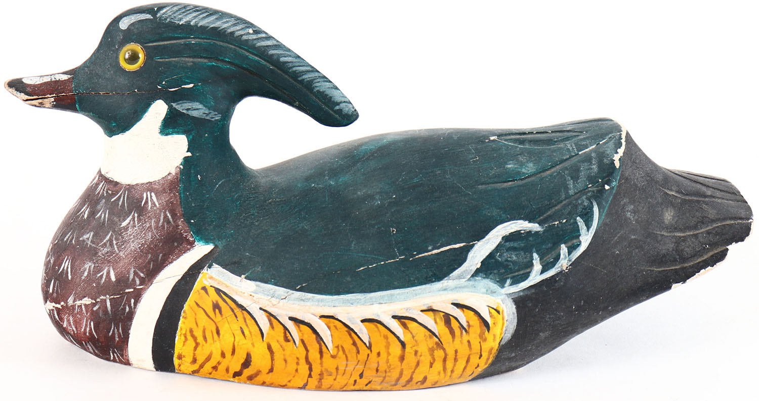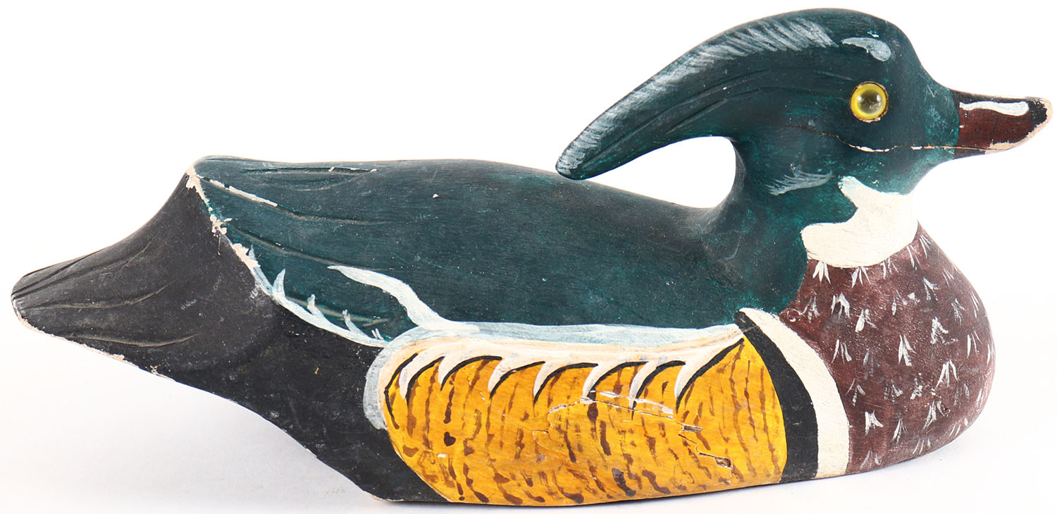 Woodduck Drake by unknown maker, glass eyes, solid wood, original paint, age crack on bill and face. Grade: Very Good - Value: 6 to 15