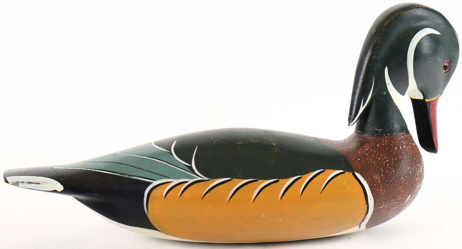 Preening Woodduck Drake by unknown maker, glass eyes, solid wood, original paint, structurally excellent. Grade: Excellent - Value: 20 to 40
