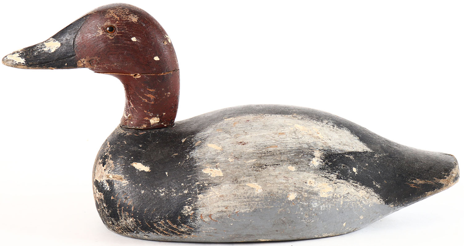 Canvasback Drake by Mason Decoy Company, Detroit, MI, 1896-1924, Seneca model, glass eyes, solid wood, repainted, paint has chips in it. Grade: Very Good - Value: 40 to 80