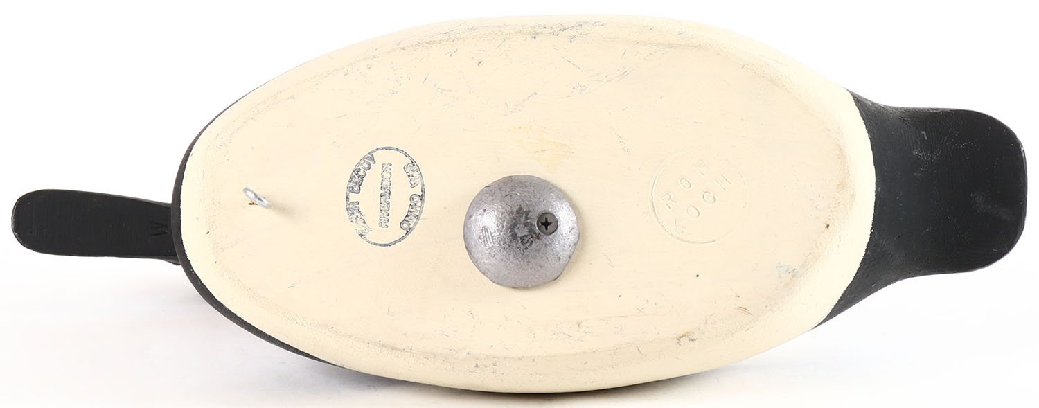 Canvasback Drake by Ron Koch, Omro, WI, glass eyes, hollow wood, original paint, structurally excellent, stamped on bottom. Grade: Excellent + - Value: 40 to 80