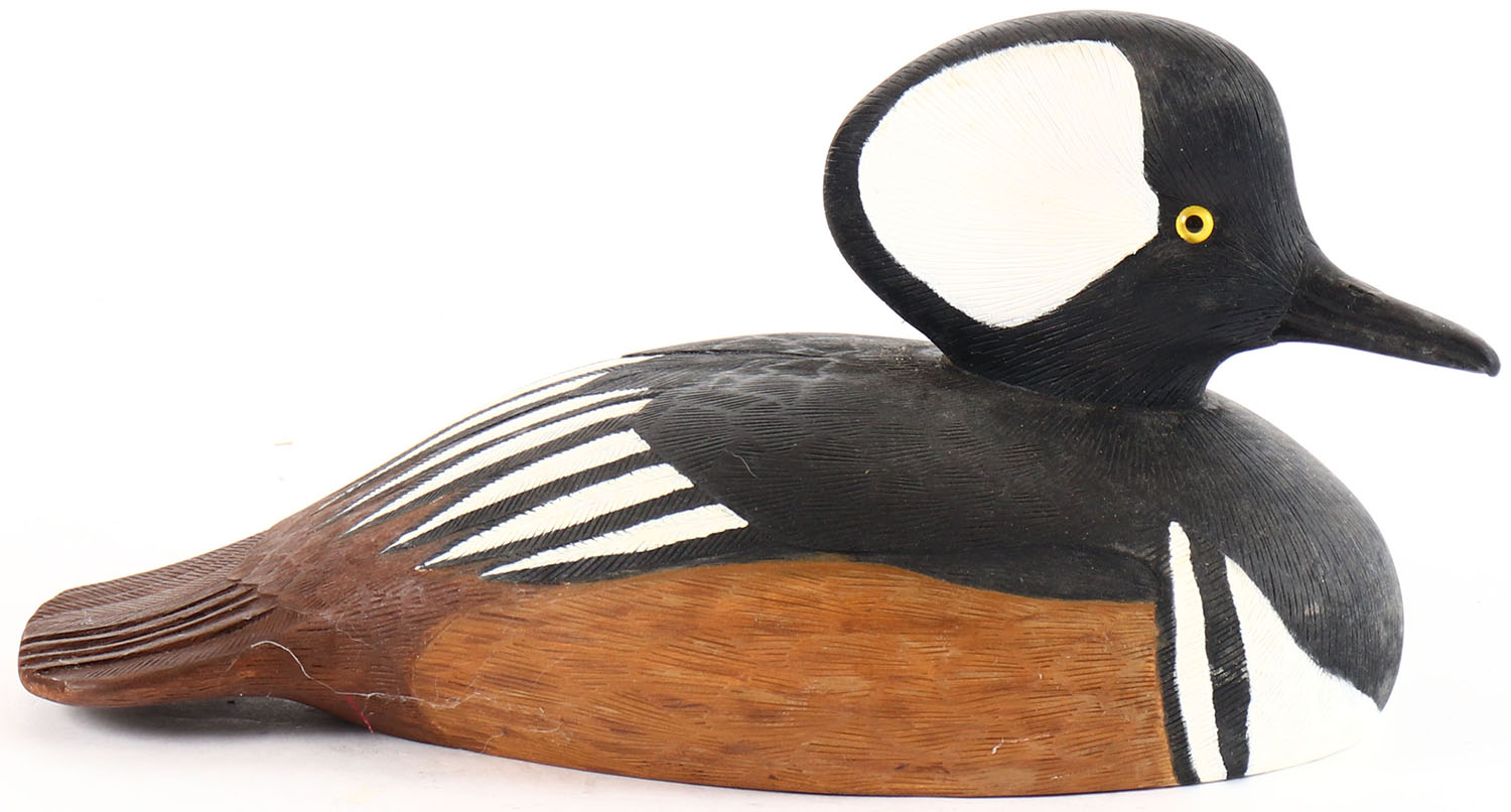 Hooded Merganser by David M. Goslee, glass eyes, solid wood, original paint, structurally excellent, signed by DAVID M. GOSLEE on bottom. Grade: Excellent ++ - Value: 20 to 40