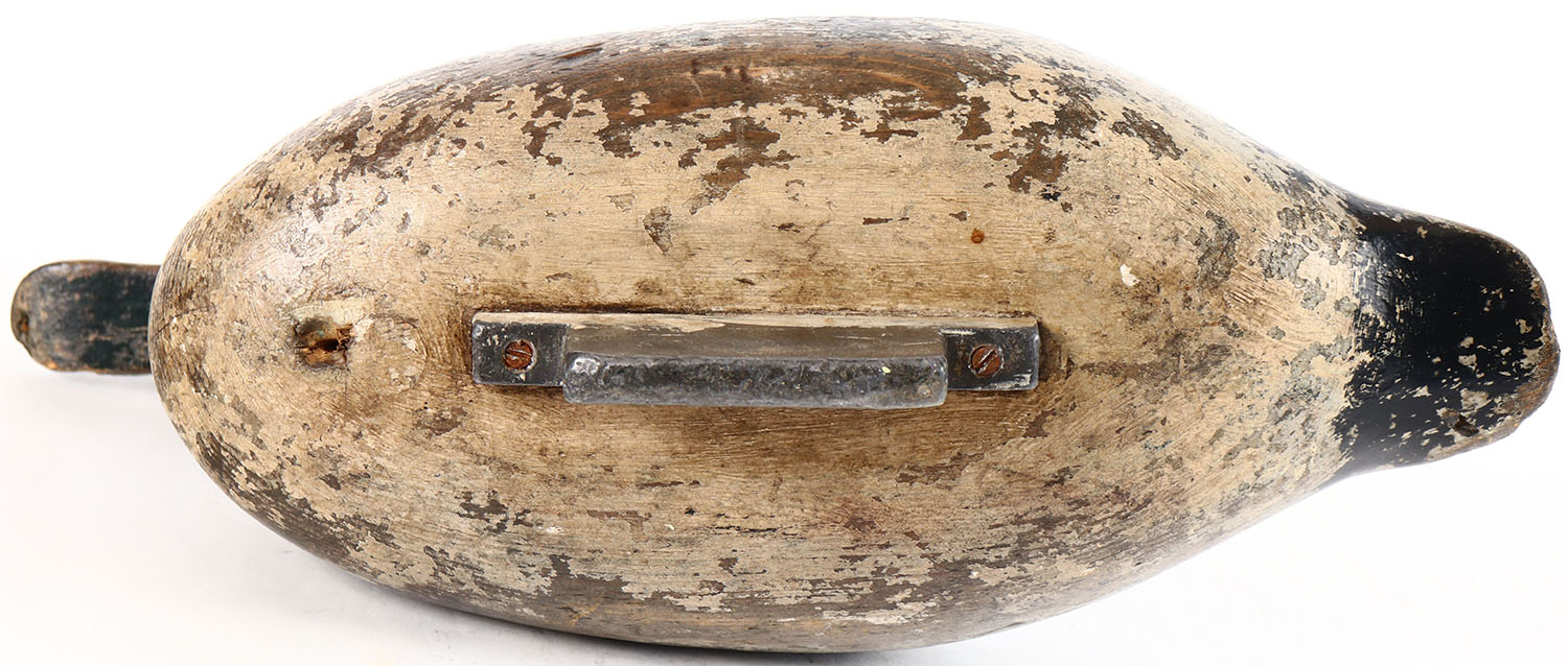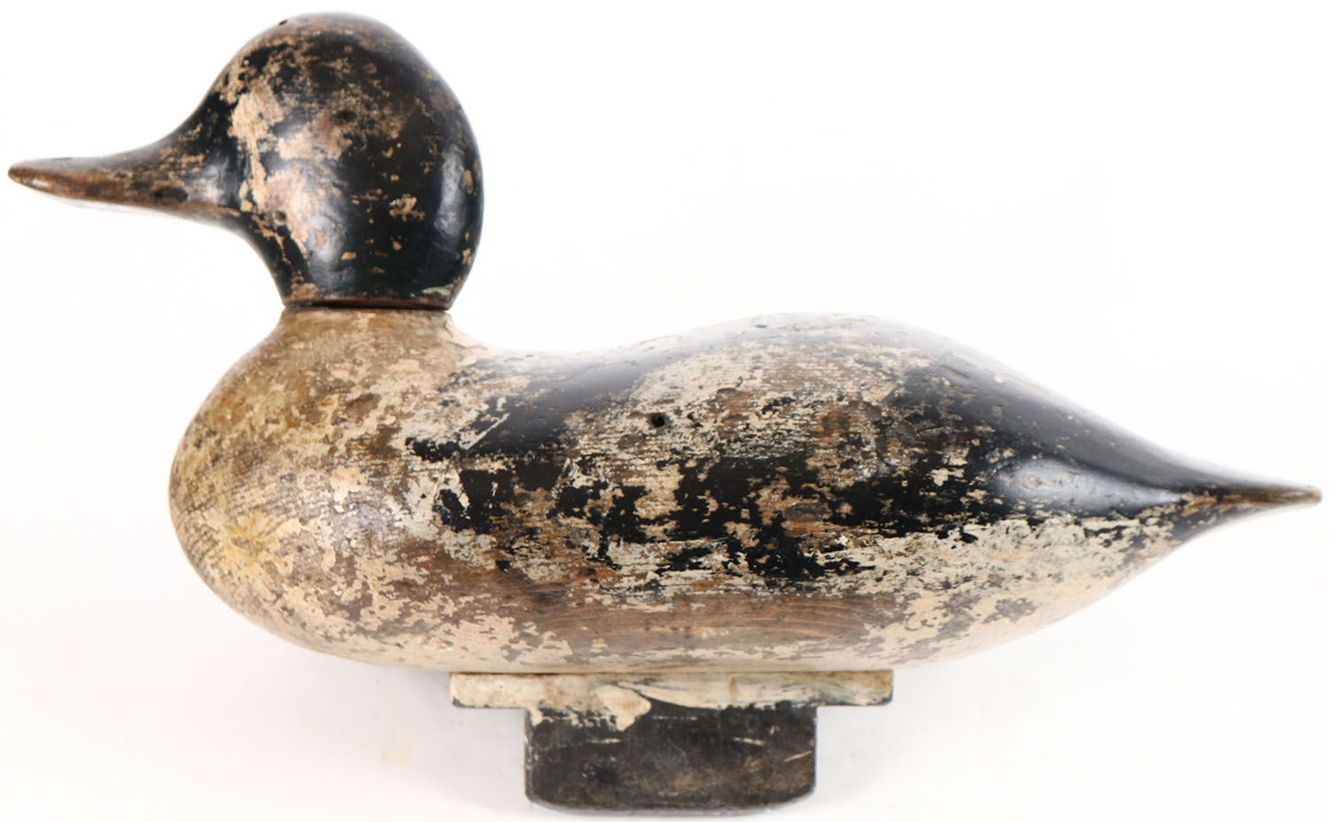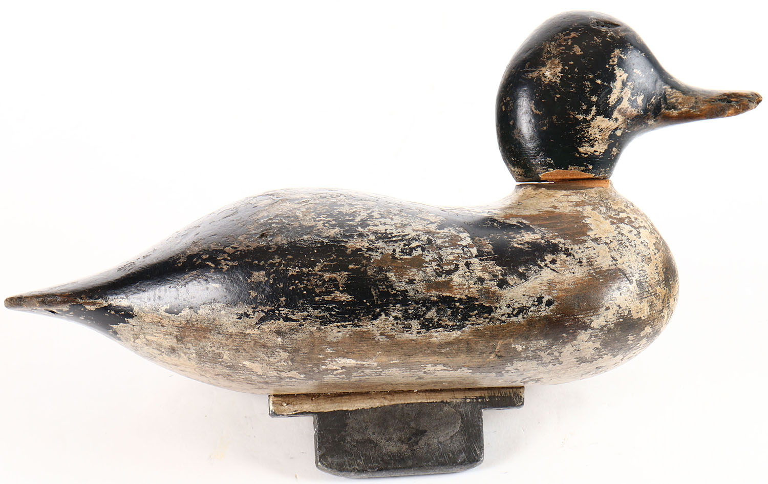 Bluebill Drake by Mason Decoy Company, Detroit, MI, 1896-1924, no eyes, solid wood, repainted, head is loose. Grade: Very Good - Value: 20 to 40