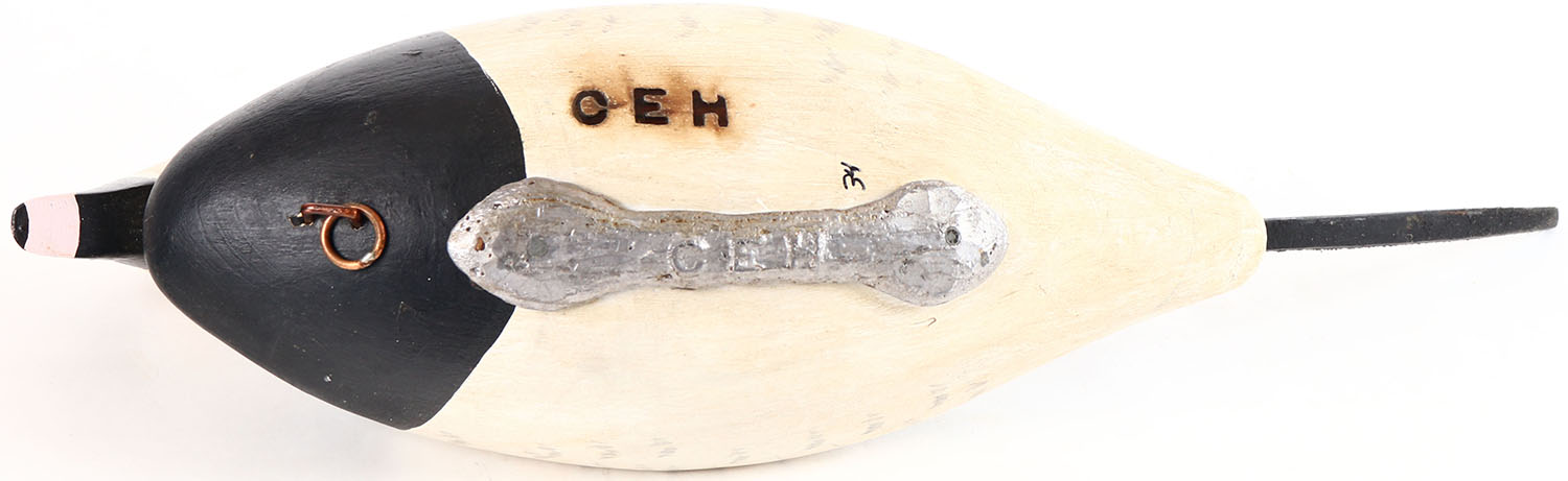 Old Squaw Drake by unknown maker with CEH brand, painted eyes, solid wood, original paint, structurally excellent. Grade: Excellent ++ - Value: 20 to 50
