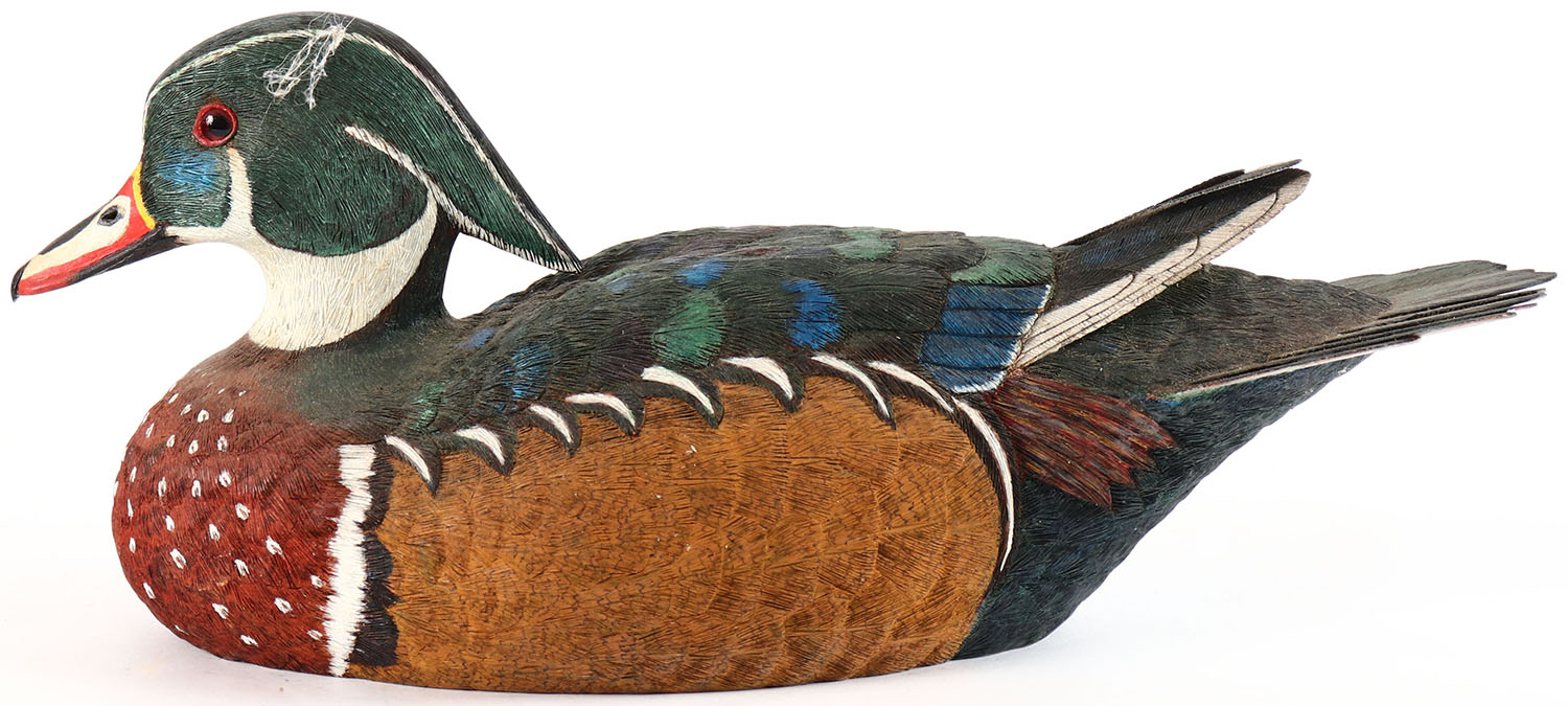 Woodduck Drake by C.R. Crawford, glass eyes, solid wood, original paint, structurally excellent, branded on bottom by C.R. CRAWFORD. Grade: Excellent + - Value: 26 to 50