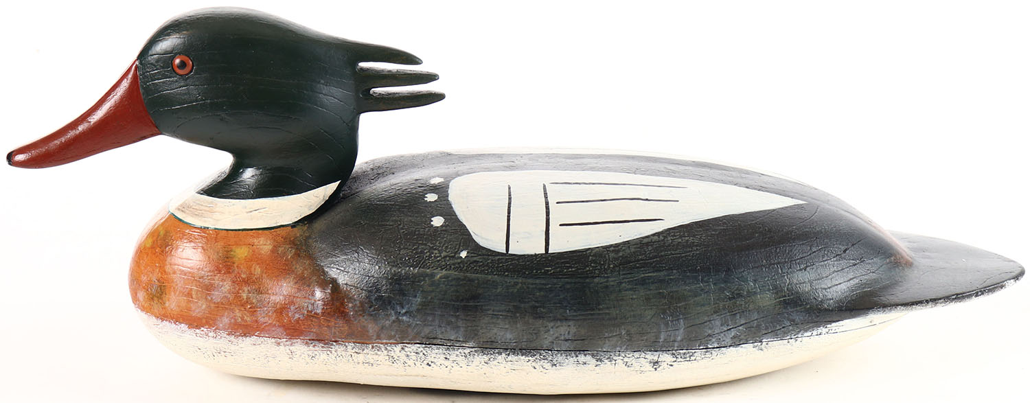 Hooded Merganser Drake by unknown maker in the style of Rowley Horner, tack eyes, solid wood, original paint, structurally excellent. Grade: Excellent - Value: 20 to 40