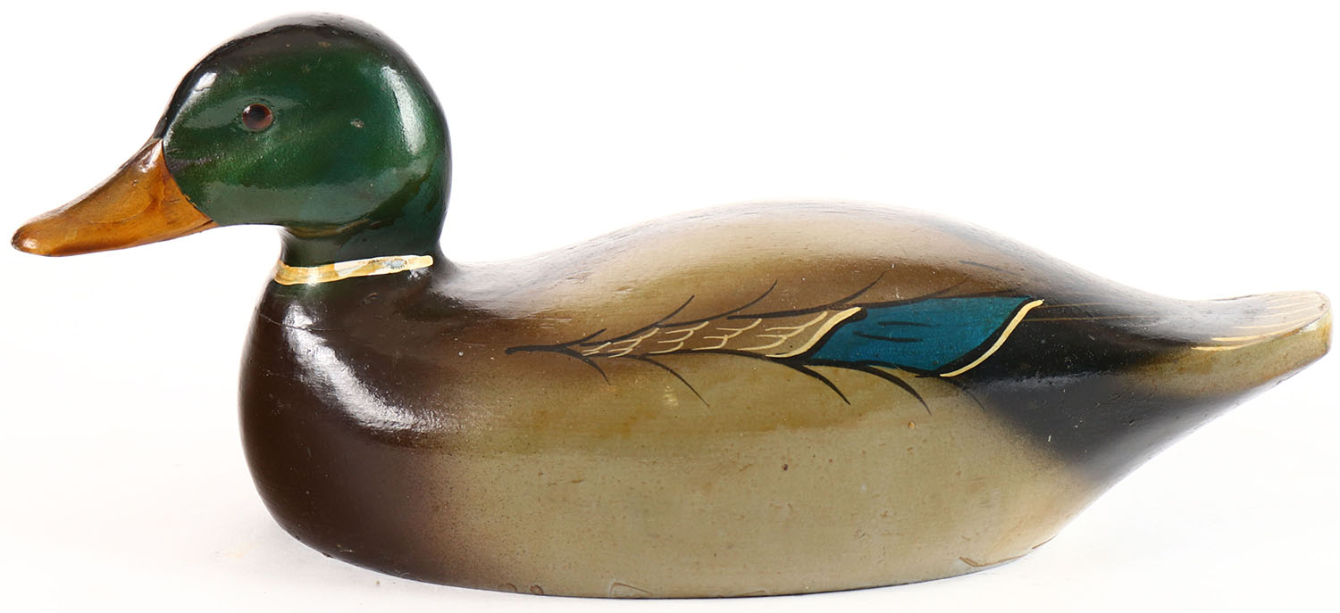 Small Mallard Drake by Michael Veasy, glass eyes, solid wood, original paint with an old coat of varnish added, structurally excellent, signed by MICHAEL VEASY on bottom. Grade: Excellent + - Value: 20 to 40