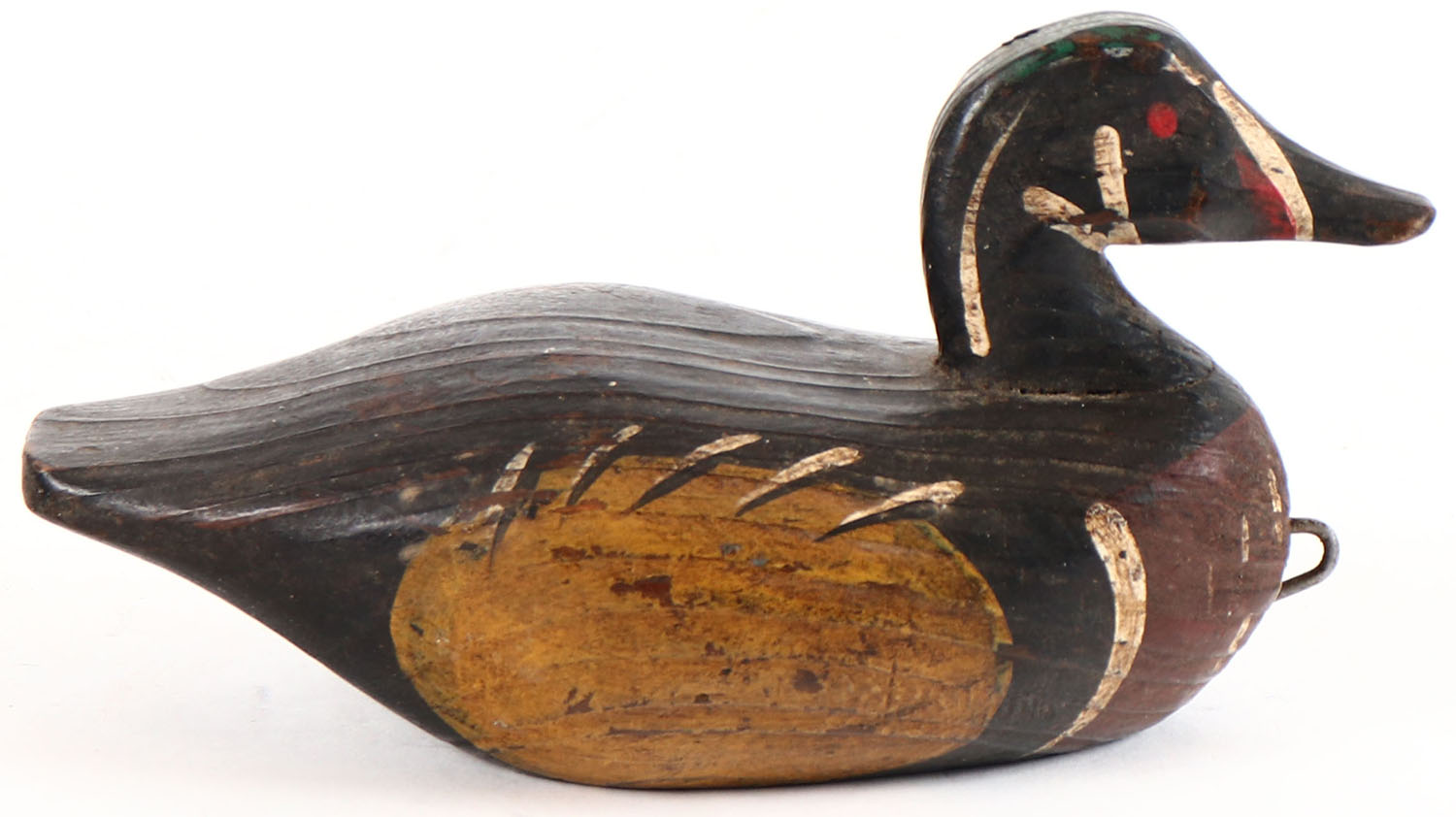 Small Woodduck Drake by Back Bay Decoys, Virginia Beach, VA, painted eyes, solid wood, distressed original paint, structurally excellent. Grade: Excellent - Value: 20 to 40