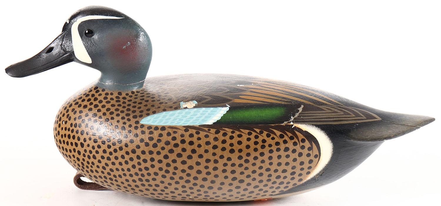Blue Winged Teal Drake by Frederick Rick Brown, PT Pleasant, NJ. Glass eyes, hollow wood, original paint, branded by FREDERICK C. BROWN on bottom, has age crack on tail, chips under neck. Grade: Very Good + - Value: 40 to 80